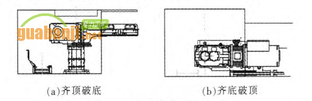 薄煤層工作面一般分為:“齊底破頂”和“齊頂破底”兩種布置方式(見圖1)。在實際工作中,為了保證刮板輸送機在采高較低的情況下具有足夠的卸載高度,盡可能減少“回煤?隋況的出現(xiàn)。一般都選用“齊頂破底”的方式,即順槽頂板與工作面頂板平齊,但順槽底板要低于工作面底板,使刮板輸送機機頭與順槽中轉載機卸料段之間留有足夠的高度差。