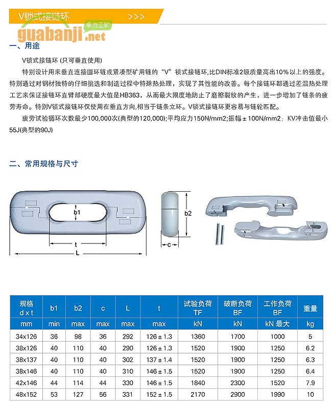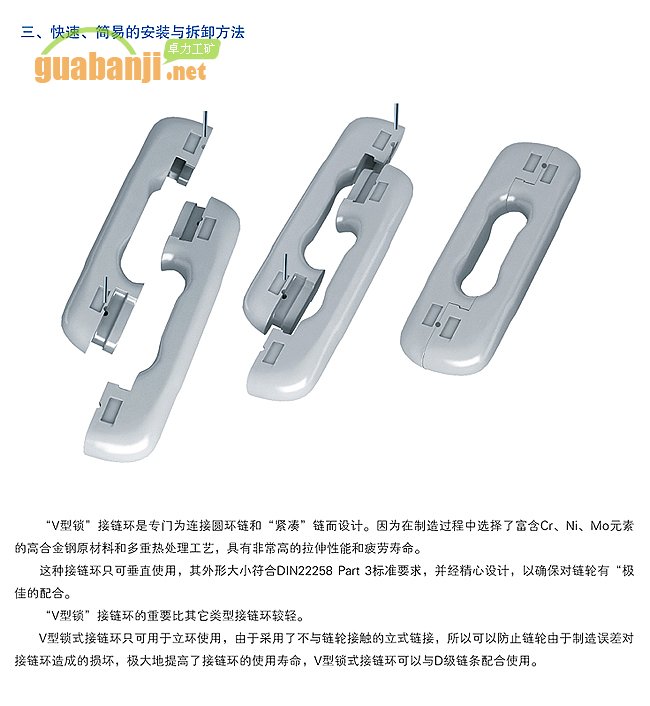 特別設(shè)計(jì)用來(lái)垂直鏈接圓環(huán)鏈或緊湊型礦用鏈的v鎖式接鏈環(huán),比DIN標(biāo)準(zhǔn)2級(jí)質(zhì)量高出10%以上的強(qiáng)度。